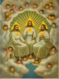 La DAME se dirige avec moi côté Épître ; elle dit : «Tu vois ici le PÈRE, siégeant sur le globe.» Sur le mur du fond, côté Épître, je vois une représentation du PÈRE, du FILS et du SAIT ESPRIT. Le PÈRE est représenté siégeant sur le globe. Une croix se dresse sur sa main droite. Au-dessus de lui, il y a une colombe de laquelle émanent de tous côtés des rayons. La DAME dit : «La CROIX dans la main, Il est recouvert de l’ombre du SAINT ESPRIT représenté sous la forme d’une colombe de laquelle émanent de tous côtés des rayons.» |