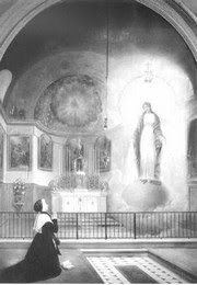faire sauter, mais il m’était dit que Dieu garderait ce temple. Puis la frappante image : une très haute estrade s’élargissant en descendant, toute composée de degrés. Je voyais le Saint-Père vêtu de blanc au sommet, puis, de chaque côté des degrés, les prêtres en robe noire ; au milieu, entouré de rayons, l’Agneau immolé qui me figurait le saint Sacrifice... Les religieux, puis les prêtres, furent presque tous enlevés, une sorte d’inondation couvrit les degrés. Je tremblais pour le divin Agneau. Puis tout se répara, les prêtres, les religieux reprirent leur place et une lumière éblouissante entoura l’Agneau et resplendit tellement jusqu’en bas que la foule indifférente s’arrêta... J’attends ce triomphe...»
