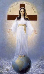 DAME DE TOUS LES PEUPLES se tient ici devant la croix de son FILS. Ses pieds sont posés sur le milieu du monde ; tout autour, le troupeau de JÉSUS-CHRIST. Je viens en ce temps comme la Corédemptrice, Médiatrice. Corédemptrice, je l’étais déjà lors de l’ANNONCIATION» Je demande maintenant à la DAME ce que cela signifie. Elle répond : «Cela signifie : la MÈRE a été faite Corédemptrice de par la volonté du PÈRE. Dis cela à vos théologiens. Dis en outre que ce dogme sera le dernier dans l’histoire mariale.» |