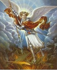 «Déjà toute la partie antérieure de l'église était abattue : il n'y restait plus debout que le sanctuaire avec le Saint sacrement. J'étais accabée de tristesse et je me demandais toujours où était donc cet homme que j'avais vu autrefois se tenir sur l'Eglise pour la défendre, portant un vêtement rouge et tenant une bannière blanche. Je vis de nouveau l'église de saint Pierre avec sa haute coupole. Saint Michel se tenait au sommet, brillant de lumière, portant un vêtement rouge de sang et tenant à la main un grand étendard de guerre. Sur la terre, il y avait un grand combat. Des verts et des bleus combattaient contre des blancs, et ces blancs qui avaient au-dessus d'eux une épée rouge et flamboyante, paraissaient avoir le dessous ; mais tous ignoraient pourquoi ils combattaient. L'Eglise était toute rouge de sang comme l'ange, et il me fut dit qu'elle serait lavée dans le sang. Plus le combat durait, plus la couleur sanglante s'effaçait de l'Eglise et elle devint de plus en plus transparente. Cependant, l'ange descendit, alla aux blancs et je le vis plusieurs fois en avant de toutes leurs cohortes. Alors, ils furent animés d'un courage merveilleux sans qu'ils sussent d'où ça leur venait ; c'était l'ange qui multipliait ses coups parmi les ennemis, lesquels s'enfuirent de tous côtés. Le glaive de feu qui était au-desss des blanc victorieux, disparut alors. Pendant le combat, des troupes d'ennemis passaient continuellement de leur côté et une fois il en vint une très nombreuse. Au-dessus du champ de bataille, des troupes de saints parurent dans l'air : ils montraient, indiquaient ce qu'il fallait faire, faisaient des signes avec la main : tous étaient différents entre eux, mais inspirés d'un même esprit et agissant dans un même esprit. Lorsque l'ange fut descendu du haut de l'Eglise, je vis au-dessus de lui dans le ciel une grande croix lumineuse à laquelle le Sauveur était attaché ; de ses plaies sortaient des faisceaux de rayons resplendissants qui se répandaient sur le monde. Les plaies étaient rouges et semblables à des portes éclatantes dont le centre était de la couleur du soleil. Il ne portait pas de couronne d'épine, mais de toutes les plaies de la tête partaient des rayons qui se dirigeaient horizontalement sur le monde. Les rayons de ses mains, du côté et des pieds avaient les couleurs de l'arc en ciel ; ils se divisaient en lignes très menues, quelquefois aussi ils se réunissaient et atteignaient ainsi des villages, des villes, des maisons sur toute la surface du globe. Je les vis ça et là, tantôt de loin, tantôt de près, tomber sur divers mourants et aspirer les âmes qui, entrant dans un de ces rayons colorés, pénétraient dans la plaie du Seigneur. Les rayons de la plaie du côté se répandaient sur l'Eglise placée au-dessous, comme un courant abondant et très large. L'Eglise en était toute illuminée, et je vis la plupart des âmes entrer dans le Seigneur par ce courant de rayons.  Je vis aussi planer à la surface du ciel un coeur resplendissant d'une lumière rouge, duquel partait une voie de rayons blancs qu conduisaient dans la plaie du côté... ...Et une autre voie qui se répandait sur l'Eglise et sur beaucoup de pays... ...Ces rayons attiraient à eux un grand nombre d'âmes qui, par le coeur et la voie lumineuse, entraient dans le côté de Jésus. Il me fut dit que ce coeur était Marie. J'eus encore la vision d'une immense bataille. Toute la plaine était couverte d'une immense fumée : il y avait des taillis remplis de soldats d'où l'on tirait continuellement. C'était un lien bas : on voyait de grandes villes dans le lointain. Je vis saint Michel descendre avec une nombreuse troupe d'anges et séparer les combatants. Mais cela n'arrivera que quand tout semblera perdu. Un chef invoquera saint Michel et alors la victoire descendra. Elle ignorait l'époque de cette bataille. Elle dit une fois que cela arriverait en Italie, non loin de Rome où beaucoup danciennes choses seraient détruites et où beaucoup de saintes choses nouvelles (c'est-à-dire inconnues jusqu'alors) reparaitraient un jour. Saint Michel descendit dans l'église (démolie à l'exception du choeur et du maître-hôtel) revêtu de son armure, et il arrêta en les menaçant de son épée, plusieurs mauvais pasteurs qui voulaient y pénétrer. Il les chassa dans un coin obscur où ils s'assirent, se regardant les uns les autres. La partie de l'Eglise qui était démolie fut en peu d'instants entourée d'un léger clayonnage, de manière à ce que l'on put y célébrer parfaitement le service divin. Puis il vint de toutes les parties du monde des prêtres et des laïques, qui refirent les murs de pierre,; car les démolisseurs n'avaient pas pu ébranler les fortes pierres des fondements». |