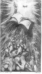 «Je me trouvai dans la Maison des Noces et je vis un bruyant cortège matrimonial arriver dans plusieurs carosses (d'où de multiples complicités et de tous ordres conspirant à sa venue). La fiancée qui avait près d'elle beaucoup d'hommes et de femmes, était une personne de grande taille, à l'air effronté et avec une parure de courtisane.(Son arrivée ne sera donc pas subreptice -fini le temps des dissimulations !- mais éclatante, dans le grand appareil d'un assentiment universel). Elle avait sur la tête une couronne, sur la poitrine beaucoup de bijoux, trois chaines et trois agrafes de clinquant auxquelles étaient suspendues une quantité d'instruments, de figures représentant des écrevisses, des grenouilles, des crapauds, des sauterelles, et aussi de petites cornes, des anneaux, des sifflets, etc. Son vêtement était écarlate. (Ne serait-elle pas amenée par la révolution ?). Sur son épaule s'agittait un hibou, lui parlant à l'oreille, tantôt à gauche, tantôt à droite : il semblait être son esprit familier. Cette femme, avec toute sa suite et de nombreux bagages, entra pompeusement dans la maison de noces et en chassa tous ceux qui s'y trouvaient. Les vieux messieurs et les ecclesiastique eurent à peine le temps de ramasser leurs livres et leurs papiers, tous furent obligés de sortir, les uns plein d'horreur, les autres plein de sympathie pour la courtisane. Quelques uns allèrent à l'Eglise (probablement de petits noyaux restés fidèles, minuscules églises du silence), d'autres dans diverses directions, marchant en groupes séparés. Elle renversa tout ce qui était dans la maison, jusqu'à la table et aux verres qui étaient dessus. Il n'y eut que la chambre où étaient les habits de la fiancée et la salle que j'avais vu se transformer en une église consacrée à la Mère de Dieu qui restèrent fermées et inates. Chose remarquable, la courtisane, tout son attirail et ses livres fourmillaient de vers luisants, et elle avait l'odeur infecte de ce scarabée brillant qui sent si mauvais. Les femmes qui l'entouraient étaient des prophétesses magnétiques : elles prophétisaient et la soutenaient. Mais cette ignoble fiancée voulait se marier et, qui plus est, à un jeune prêtre pieux et éclairé. Je crois que c'était un des douze que je vois souvent opérer des oeuvres importantes sous l'influence de l'Esprit-Saint. Il s'était enfui de la maison devant cette femme. Elle le fit revenir en lui adressant les paroles les plus flatteuses. Quand il arriva, elle lui montra tout et voulait tout remettre en ses mains». (La partie purement, mais aussi fort clairement symbolique, a donc cessé pour aborder un thème plus étroitement prophétique). |